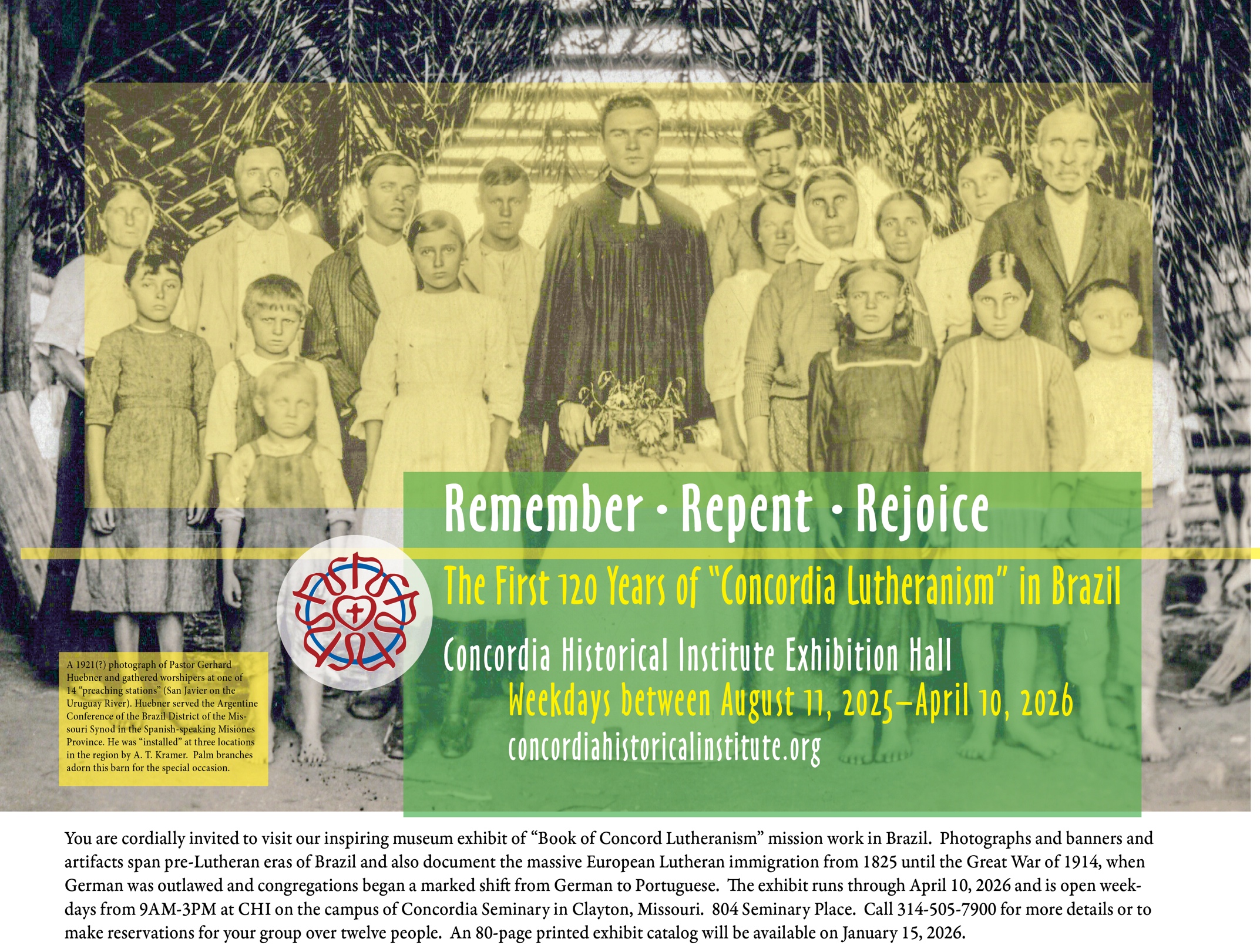 This multimedia exhibit utilizes photos, banners, and artifacts to tell the history of the early years of “Concordia Lutheranism” in Brazil. Using over 300 photos and a progression of banners to tell this history in three museum rooms, Concordia Historical Institute is pleased to trumpet this exhibit to anyone interested in missions. This exhibit opened on August 11, 2025, and runs until April 10, 2026. An 80-page exhibit catalog will be available January 15, 2026.