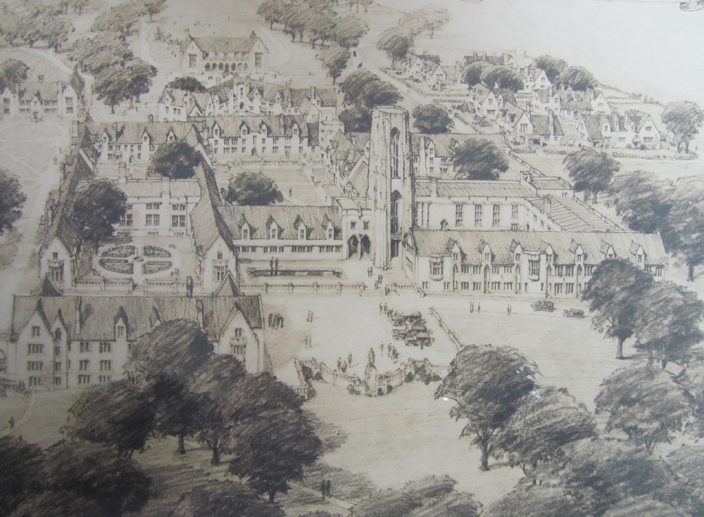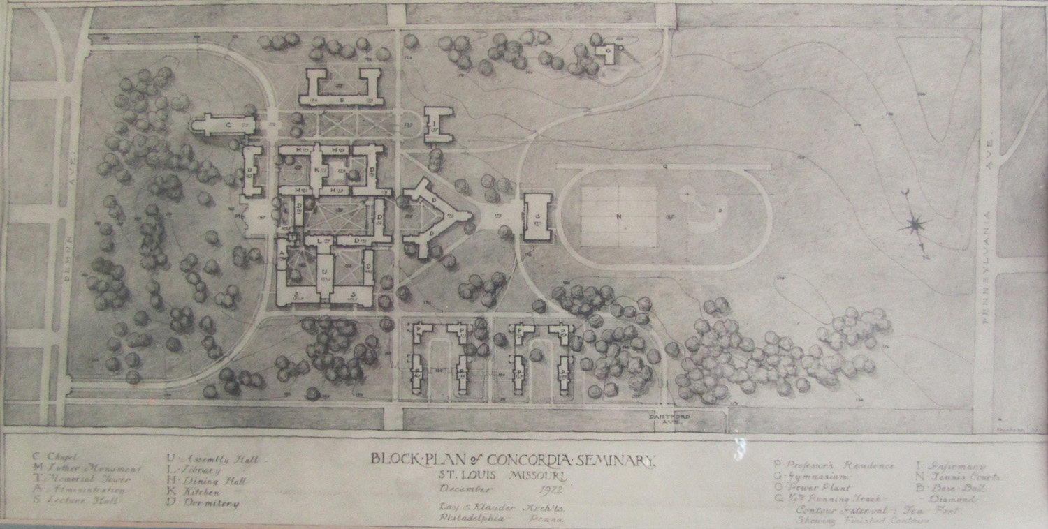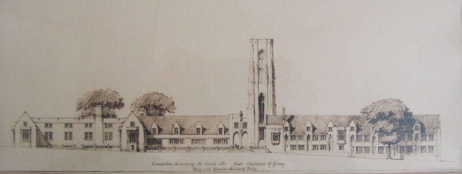 Significance: Over eighty years ago, the Clayton campus of Concordia Seminary, Saint Louis, was dedicated on June 13, 1926. This drawing shows the architect’s original plans for the campus. Charles Klauder was the architect who drew up the plans for the Gothic-style seminary campus. (Click on images for larger views.)